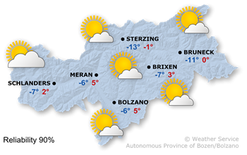 In the morning, the weather will be sunny over the entire province, while in the afternoon the cloudiness will tend to increase from the west. Very negative minimum temperatures, maximums between -1° in Sterzing and +5° in Bozen.