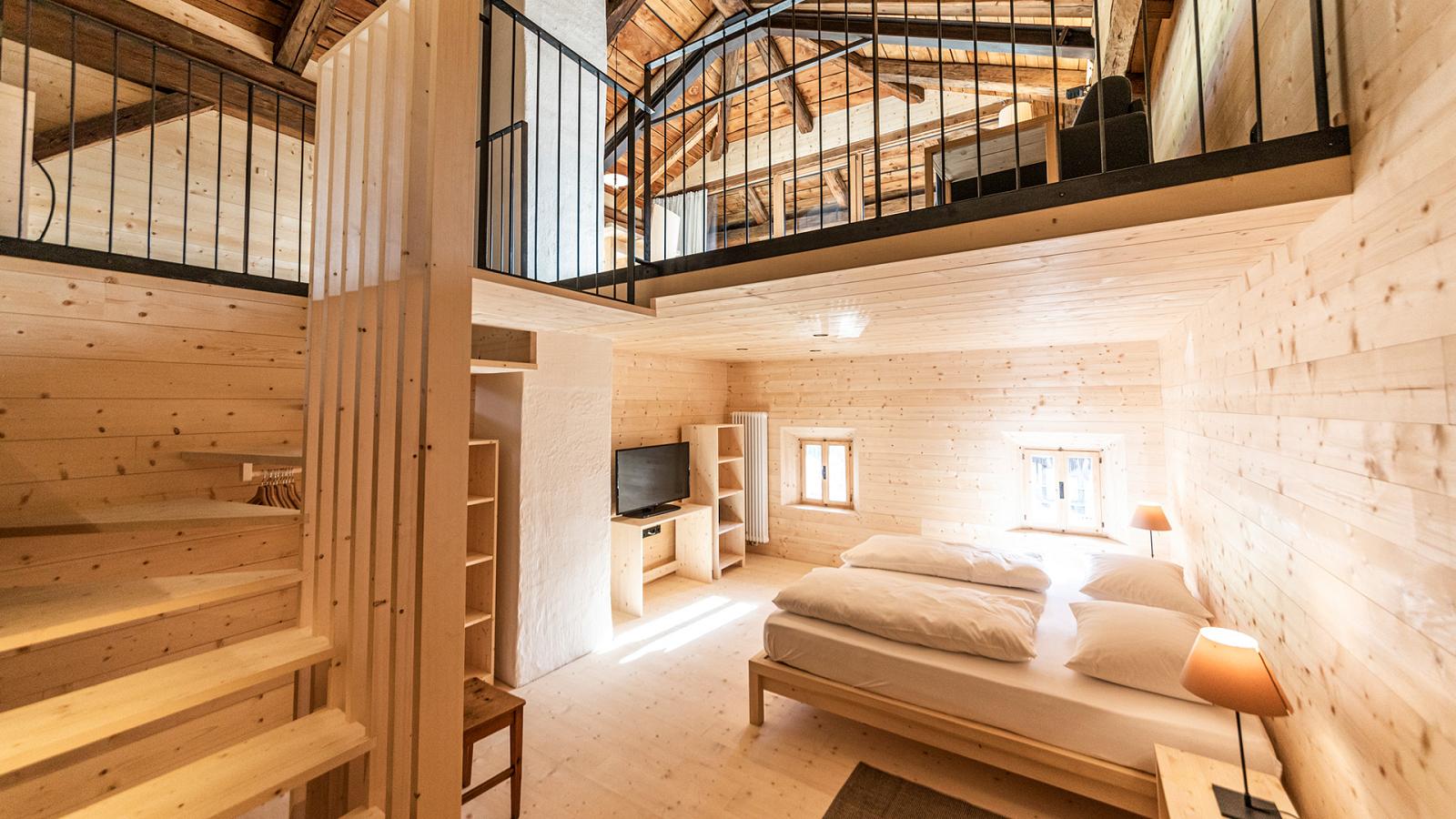 Spaziosa suite con pavimento e mobili in legno naturale di pino, letto matrimoniale king-size, galleria con comodo divano letto matrimoniale e balcone con vista sui prati di Sesto. Ampio bagno, doppio lavabo, doccia walk-in e toilette e bidet separato. La colazione e la cena vengono servite presso l'Hotel Strobl situato difronte. Al piano si trova una lounge a Vostra disposizione.