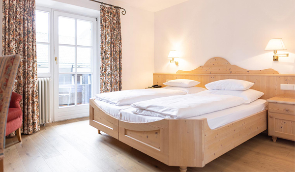 Accogliente camera arredata con mobili in abete rosso, dotata di bagno con lavabo in marmo, doccia o vasca e bidet. Dal balcone si possono ammirare le montagne circostanti diversamente illuminate a seconda dell'ora del giorno.
