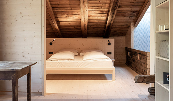 Al terzo piano, legno di abete rosso naturale e profumato interpretato in chiave moderna, materiali pregiati, illuminazione d'atmosfera, angolo salotto, letto king size posizionato davanti a una vista spettacolare. Ampia vetrata con affaccio sulla terrazza con meravigliosa vista panoramica. Alcune camere sono dotate anche di una piccola loggia.